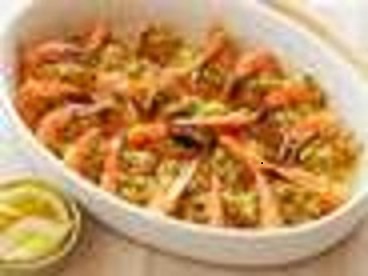 Starting from the outer edge of a 14-inch oval gratin dish, arrange the shrimp in a single layer cut side down with the tails curling up and towards the center of the dish. Pour the remaining marinade over the shrimp. Spread the butter mixture evenly over the shrimp. Bake for 10 to 12 minutes until hot and bubbly. If you like the top browned, place under a broiler for 1 minute. Serve with lemon wedges.