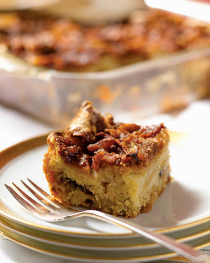 Transfer cake to oven and bake until the sides of the cake pull away from the baking dish very slightly and topping begins to caramelize, about 1 hour and 15 minutes. Remove cake from oven and let stand for several hours until completely cool, before cutting. Keep cake covered tightly with plastic wrap for up to 2 days, as the flavor improves with age.