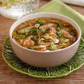 In a medium saucepan, render the bacon until it just starts to crisp. Add in the ginger, garlic, 1 cup scallions, asparagus, and mushrooms, then sauté for a few minutes. Put in the flour and cook for 1 minute. Pour in the soy sauce and chicken stock and bring to a simmer while stirring.