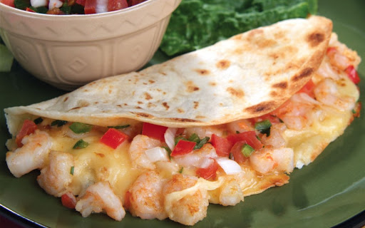 3. Ponga un sartén grande sobre una flama media. Ponga una tortilla en el sartén y póngale encima un cuarto de queso, un cuarto de camarones y salsa. Doble la tortilla por la mitad.