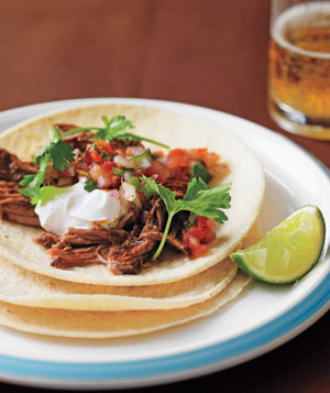 Meanwhile, using 2 forks, shred the pork and stir into the cooking liquid. Serve with the tortillas, cilantro, sour cream,