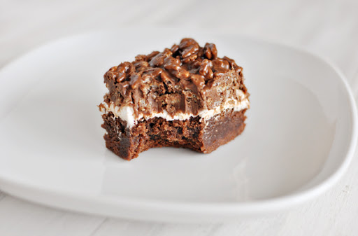 Let the pan of brownies cool to room temperature and then refrigerate until the chocolate krispie topping is set, 1-2 hours. Serve chilled.