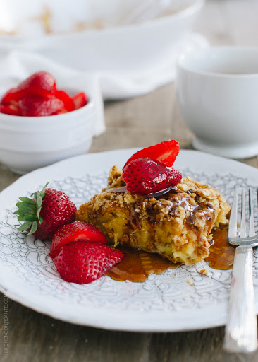 Sprinkle the oat streusel over the soaked bread, pressing down gently with your hands. Bake the french toast for 45 minutes or until it is just firm.