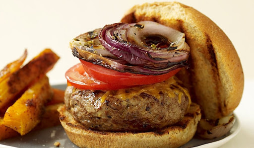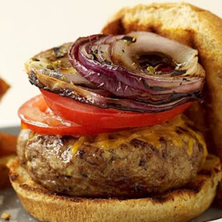 Lightly toast open-faced buns on grill. Place burgers on buns and top each with 1 slice onion (separated into rings) and 2 tomato slices. Yields 1 cheeseburger per serving.