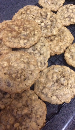 Heat Oven to 350F. Mix brown sugar and butter until blended, add vanilla and egg and mix until light and fluffy. Mix in oats, flour, baking soda, and salt; stir in chocolate chips and nuts.