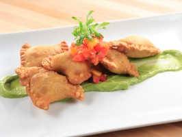 Garnish the empanadas with the avocado jalapeno puree and top with the pico de gallo.