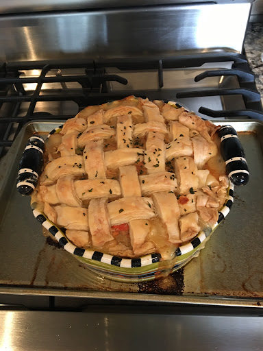 Spoon the chicken mixture into the casserole. Weave a lattice pattern over the filling with the pastry strips. Trim any excess pastry. Sprinkle with the remaining parsley. Place the casserole onto a baking sheet.