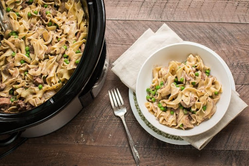 4. Add the cooked noodles on top of the meat and sauce in the slow cooker. Add the peas. Stir until everything is combined. Add salt to taste.