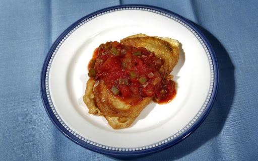 Turn over the chile relleno and fry an additional 1 to 2 minutes until golden on all sides. Remove the chile relleno with a slotted spatula or spoon, and place on a warm plate. Repeat until you have 6 chiles rellenos.