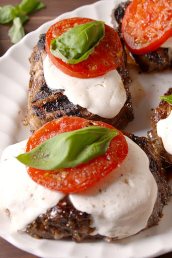 Heat grill to high. Grill steak 5 minutes per side, then top with mozzarella and tomatoes and cover grill until cheese is melty, 2 minutes.