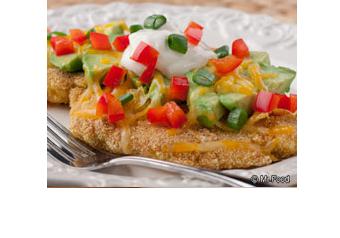 Bake for about 15 minutes, or until the chicken is fork-tender and the cheese is melted. Remove from the oven and top with sour cream, sliced scallion, and red pepper, dividing them evenly over the chicken pieces.