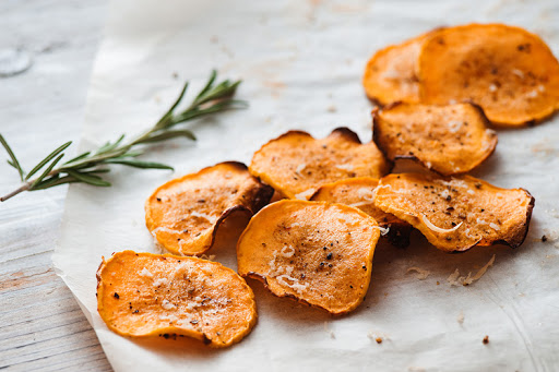 Bring a pot of water to a boil. Gently drop the sliced butternut squash into the water and boil for one to two minutes. This will allow the squash to bake and become crispy, like a chip. Squash should still be slightly firm–not mushy. Drain the squash and rinse in cold water to stop the cooking process. Gently pat dry.
