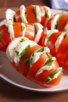 Place cut tomatoes on a serving platter. Insert marinated cheese slices and pieces of torn basil into each slit. Drizzle the tomatoes with balsamic glaze and serve immediately.