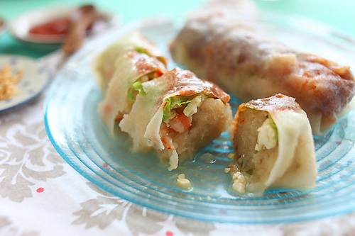 Lay a piece of the Popiah wrapper on a flat board. Spread a little sweet sauce or hoisin sauce and a little chili sauce on it. Place a lettuce leaf over the sauces. Spoon 3 tablespoons of filling onto the leaf. Top with the fried bean curd and fried shallot crisps. Fold up the two sides of the wrapper and roll up. (You can view the step-by-step pictures of rolling popiah here.) If you wish, you can scoop a tablespoon of the filling juice on top of the Popiah. Serve immediately.