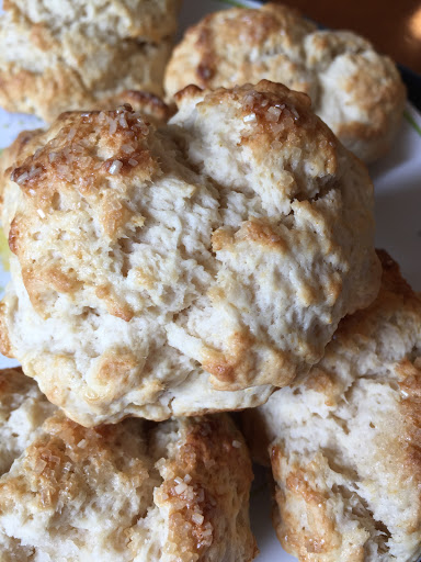 Using a large cookie scoop, place dough on cookie sheet. Brush with cream and sprinkle with turbindo sugar or sparkling sugar.