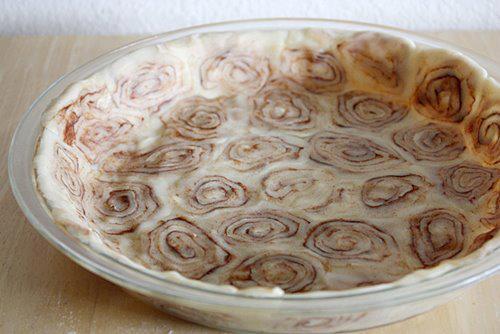 2 Press miniature cinnamon rolls, flat side down, evenly into the bottom and sides of a 9-inch glass pie plate, making sure there are no spaces between the rolls. Brush pie crust lightly with egg white/water mixture.