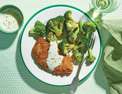 Crispy Oven-Fried Chicken Cutlets with Roasted Broccoli and Parmesan Cream Sauce