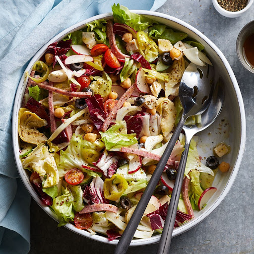 In this antipasto recipe, we turn the ingredients of the antipasto platter into a big healthy salad with the addition of leafy greens and other vegetables for a fun, healthy dinner. Serve with crusty Italian bread.