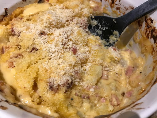 Stir potatoes into ham mixture; transfer to the prepared baking dish.