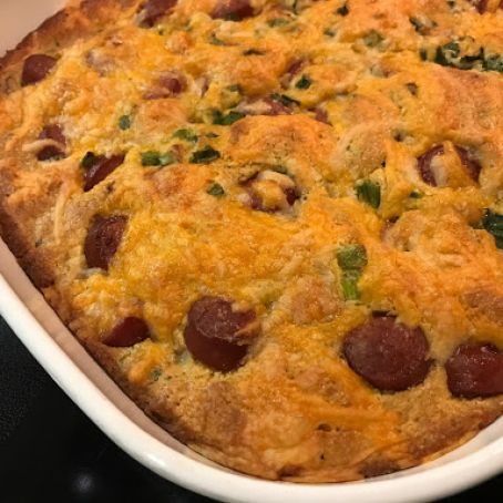 In a large bow, combine the eggs, milk, sage and pepper. Add the remaining hot dog mix. Stir in corn bread mixes. Add 1 1/2 cups cheese. Spread into a shallow 3-quart baking dish. Top with the reserved hot dog mix (the 1 cup that was set aside) and remaining cheese.