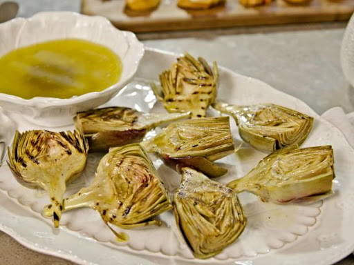 Place the artichokes on the grill, cut-side down; grill until nicely browned, 4 minutes. Turn the artichokes and grill for another 2 minutes, pressing down gently for even browning.