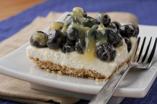 A nutty graham cracker crust is topped with creamy cheesecake, fresh blueberries and lemon curd for the perfect dessert or snack bar!