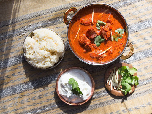 Heat butter in 6-qt. saucepan over medium-high heat. Add coriander and cumin; toast 4–6 minutes. Add paprika and onions; cook until soft, 6–8 minutes. Add remaining paste; brown for 5–6 minutes. Add tomatoes; cook for 2 minutes. Stir in cream and 1 cup water; boil. Reduce heat; simmer until thickened, 6–8 minutes. Stir in remaining masala and chicken; season with salt. Serve with garnishes and rice.