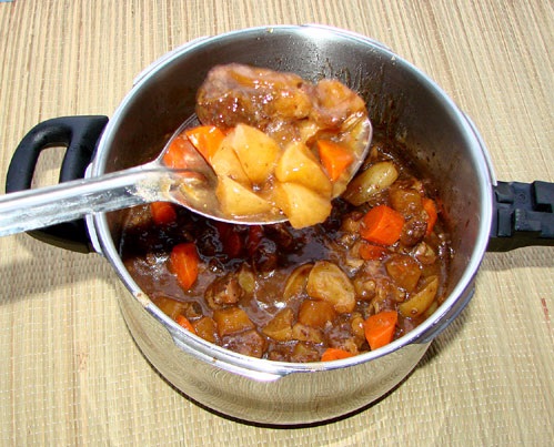 Stir cooked spare ribs with sauce, then add the drained chunks of pineapple, daikon and carrots and bring back to pressure for another 5 minutes.