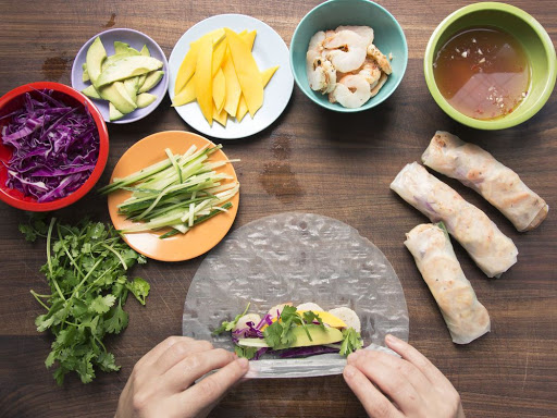 Using both hands, lift the bottom of the wrapper up and over the filling, press down gently, and roll the wrapper completely around the filling into a tight cylinder, folding the sides of the wrapper halfway through rolling. Place the summer roll on a serving platter, and cover with another damp towel. Repeat making summer rolls with the remaining wrappers, shrimp, avocado, mango, cucumber, cabbage, and cilantro leaves. Serve immediately with dipping sauce.