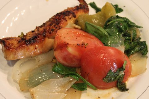 Grilled Veggies - preheat oven to 350. Place Onions and bell peppers in roasting pan, sprinkle with salt and pepper and drizzle with Olive Oil. Bake for 25 minutes. Remove from oven, add tomatoes and spinach and sprinkle with Greek seasonings. Mix well. Place back into the oven for 15 minutes.