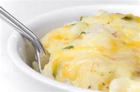 Cook & mash potatoes. Cream together sour cream and cream cheese and fold into potatoes. Season with garlic salt. Dot with butter.