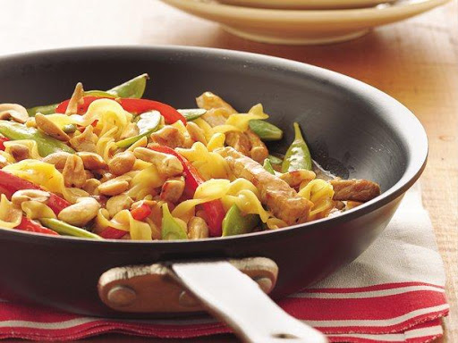3 Stir in pea pods and bell pepper. Cover and cook 5 to 8 minutes, stirring occasionally, until vegetables and noodles are tender. Sprinkle with cashews.