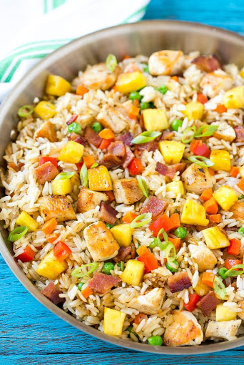 Add the onion and carrot to the pan, cook 3-5 minutes or until softened. Stir in the red bell pepper, pineapple and bacon; cool 2-3 minutes more.
