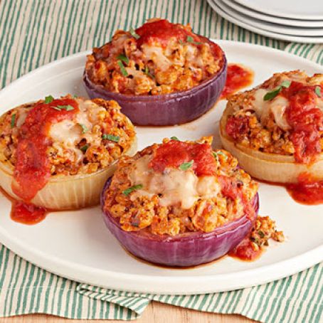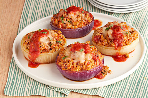 Place 1 of the removed onion pieces in bottom of each onion half, cutting as necessary to completely cover bottom of onion shell. Chop enough of the remaining removed onion pieces to measure 1/2 cup. Reserve any remaining onion pieces for another use.