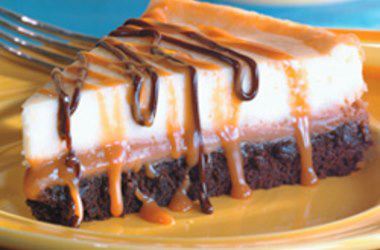 Heat reserved caramel mixture, and spoon over cheesecake.