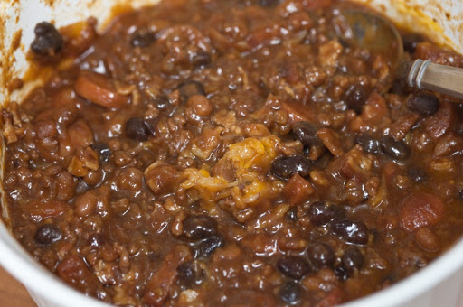 Fry bacon, add hamburger, Portuguese sausage, hot dogs, round onion, pork and beans and lack beans (don't drain, use whole can).