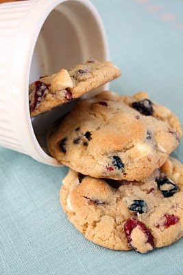 2. In a large mxing bowl cream together the butter, brown sugar and white sugar until smooth. Beat in the egg and extracts. Combine the flour, baking soda, and salt; beat into the sugar mixtue. Stir in the dried berries and chocolate chips and mix to combine. Drop by heaping spoonfuls onto prepared cookie sheet.
