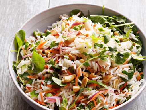 Add the carrot, cucumber, peanuts, cilantro, mint, basil and watercress to the bowl with the rice. Add the dressing mixture and gently toss.