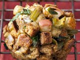 Butter 12 muffin cups, 2 tins, liberally with remaining butter. Use an ice cream scoop to fill and mound up the stuffing in muffin tins. Remove the bay leaf as you scoop the stuffing when you come upon it. Bake until set and crisp on top, 10 to 15 minutes. Remove stuffin’ muffins to a platter and serve hot or room temperature.