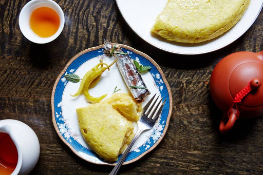Return clean pan to stove over high heat. Add 2 teaspoons reserved oil and tilt pan to coat. Once oil is just hot, add egg batter, gently swirling pan to prevent sticking as sides begin to set. Once batter starts moving as a unit when swirled, after no more than 2 minutes, you’ll know it’s ready to flip.