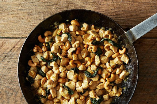 Pour the sauces into the chicken and mix well. Add the basil and fry for another 30 seconds. If the chicken looks dry, add a splash of water. Throw in the cashew nuts and turn the flame off. Stir the cashew nuts into the chicken.