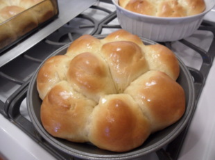 Deflate the dough and turn it onto a well floured surface. Divide into 3 equal pieces and divide into 8 balls. You should end up with 3 pans of buns.Grease and flour 3 cake pans. cover and let rise again till doubled about 40 minutes. Meanwhile, preheat oven to 350F.