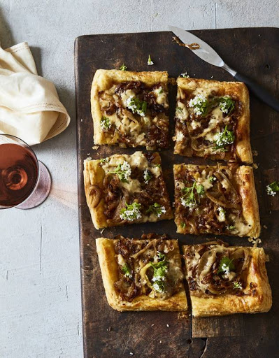 Preheat oven to 400 degrees and remove puff pastry from freezer. Melt butter in a large sauté pan over medium heat. Add sliced onions and season with a pinch of salt. Cook, stirring, until onions caramelize but retain some bite, about 15 minutes.