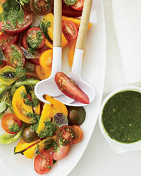 In a food processor, pulse the garlic until chopped. Add the basil and pulse until finely chopped. Add the oil, vinegar and crushed red pepper and process until smooth. Season with salt and pepper.
