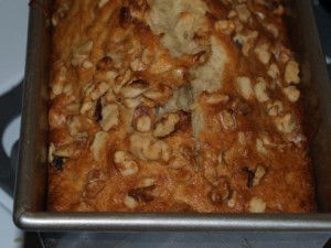 Pour batter into a greased 8×4 inch loaf pan. Then top the batter with the remaining chopped walnuts. Bake at 350 degrees for 55 to 60 minutes or until a toothpick inserted near the center comes out clean. Cool for 10 minutes on a wire rack.
