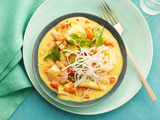 Ladle the curry into bowls. Garnish with the fried noodles, cilantro and peanuts.
