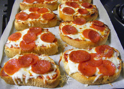 Remove from oven and spread toast with pizza sauce (*Before adding the sauce, I sprinkled a little Parmesan and mozzarella on the toast to keep the sauce from soaking up in the bread); then top generously cheese, then pepperoni.