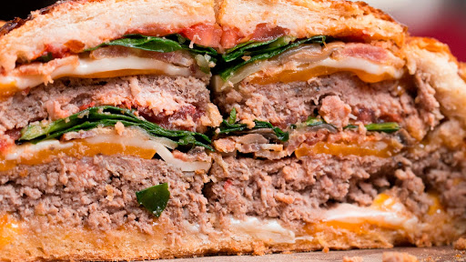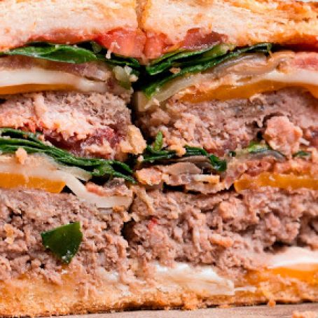 5. Layer more cheese on top of the patty and continue by adding bacon, sauteed mushrooms & onions, spinach, and tomato.