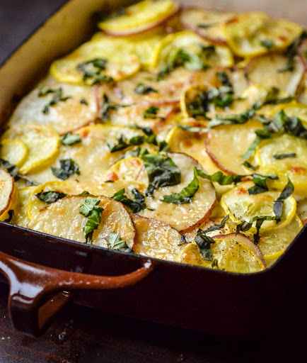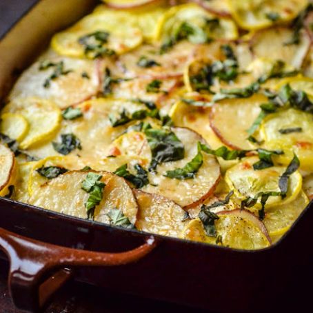 This is an easy, rustic recipe that makes a great vegetarian meal or a pretty side dish for summer or autumn. It's so simple: Yellow squash layered in a jumble with sliced red potato and goat cheese. No cream needed at all.