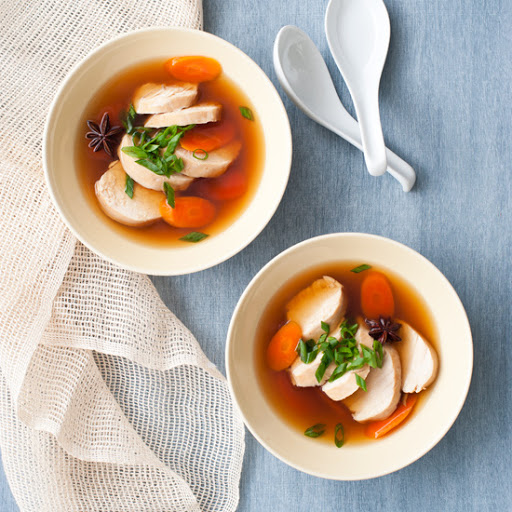 Chicken breasts poached in a broth flavored with star anise, cinnamon, ginger, scallions, and soy sauce is a Chinese classic. Traditionally you would save, not serve, the broth—it improves each time you use it—but we can never resist serving it with the chicken as a light sauce. If you like, boil noodles separately and add them to the broth for a meal in a dish.